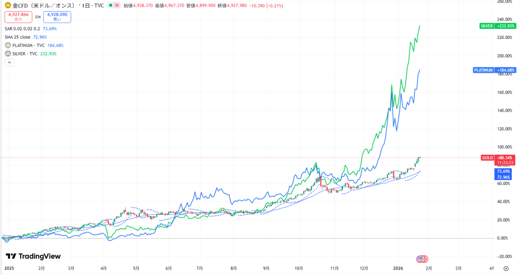 去年2025年から現在(2026年1月)にかけて、貴金属(金、銀、プラチナ)の価格高騰が熱いですね。